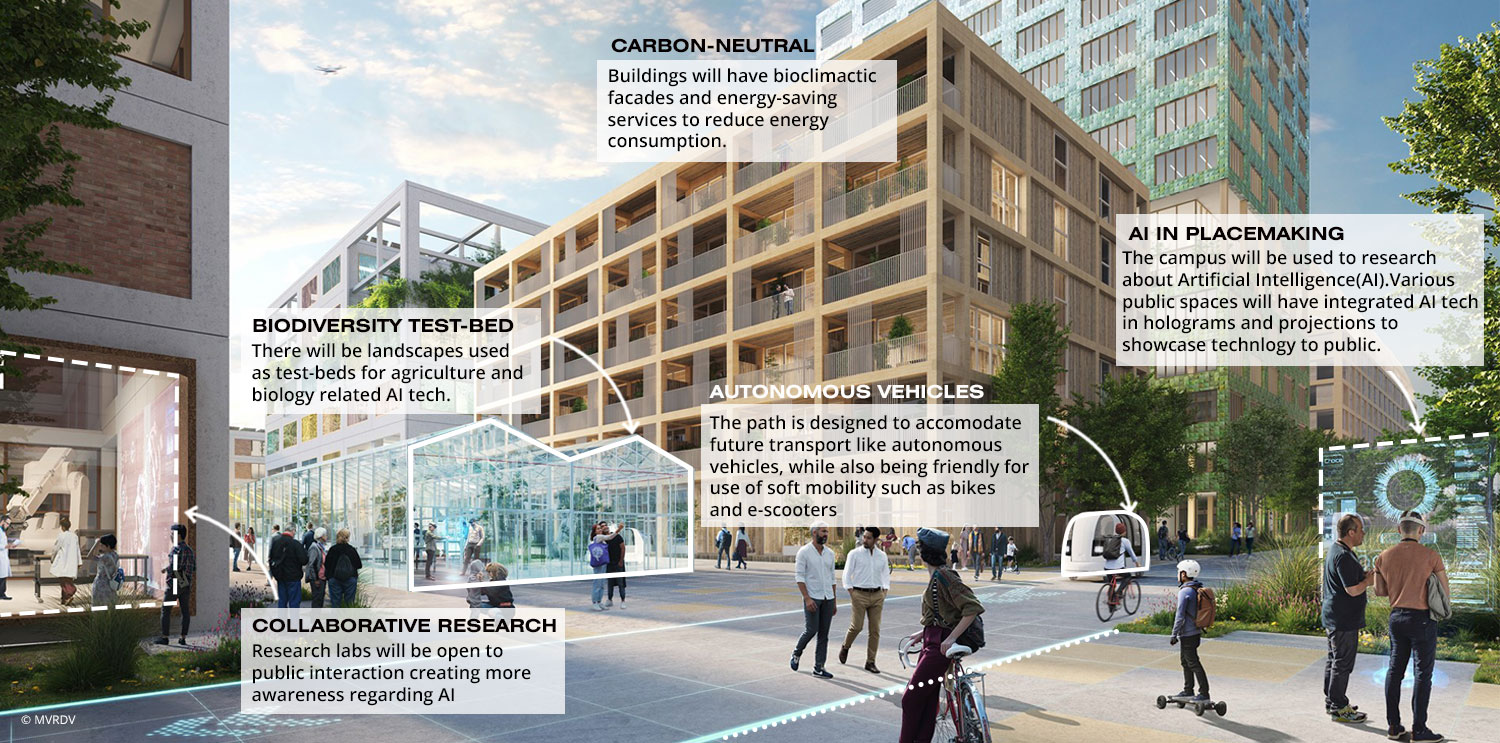 -AI IN PLACEMAKING The campus will be used to research about Artificial Intelligence(AI).Various public spaces will have integrated AI tech in holograms and projections to showcase technlogy to public.